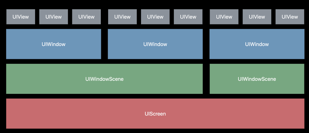 그러니까 이 물리적인 스크린 위에 UIWindowScene을 여러 개 배치할 수 있고, 그 위에 UIWindow와 UIView가 쌓인다고 보시면 될 것 같습니다