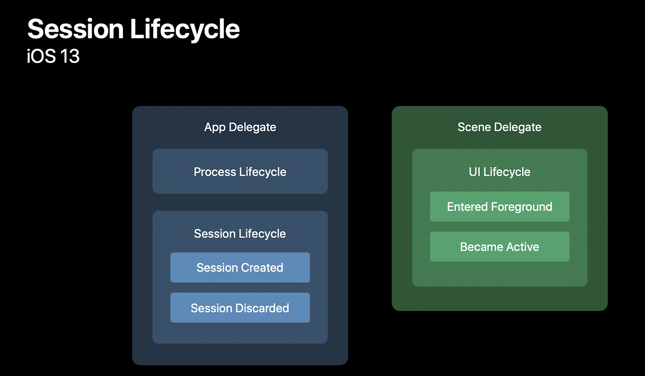 그리고 SceneDelegate의 등장으로 Scene에 대한 정보를 받아오기 위해 Session Lifecycle이라는 것이 생겨났고 아래와 같은 2가지의 새로운 메서드를 가지게 되었습니다
