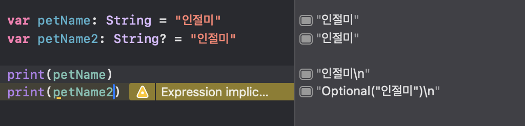 본격적으로 위의 코드들로 개념을 살펴보면 현재 옵셔널이 포함되지 않은 String 타입으로 petName이라는 변수를 선언하고 있습니다