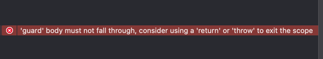 아래와 같이 return이나 throw로 guard문을 끝내줘~ 하는 에러가 발생합니다