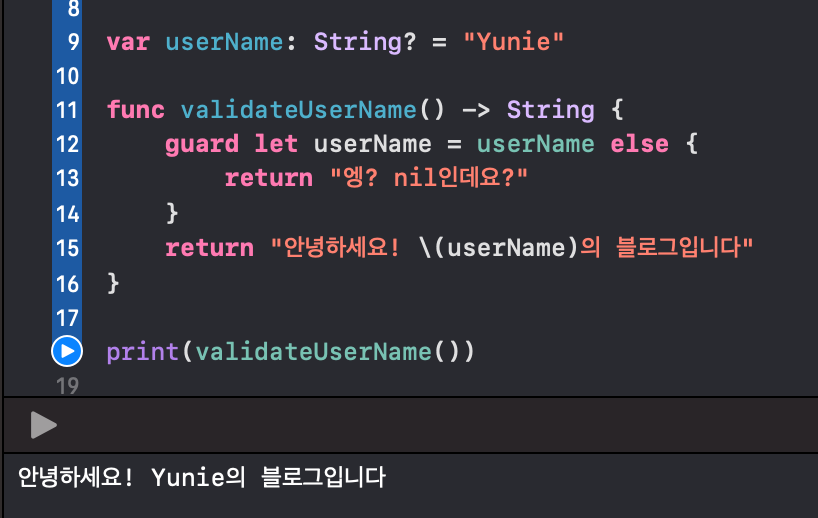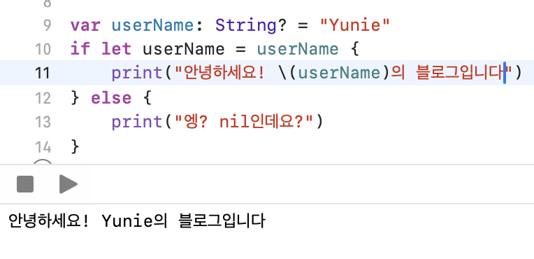 1. 저는 if let 구문의 userName과 헷갈리지않게 optionalUserName이라는 이름으로 Optional String Type에 "Yunie"라는 값을 넣어줬습니다