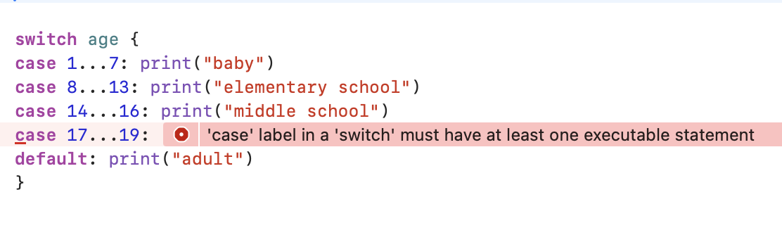 이때, age(Int)를 기준으로 처리할 것이라고 이미 정의를 해주었기 때문에 if문처럼 age를 계속해서 써줄 필요가 없습니다