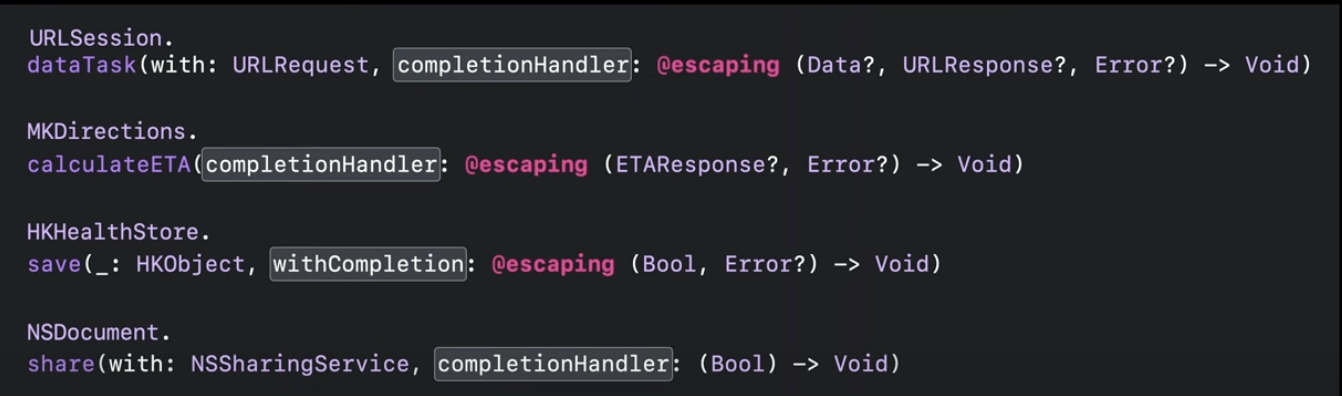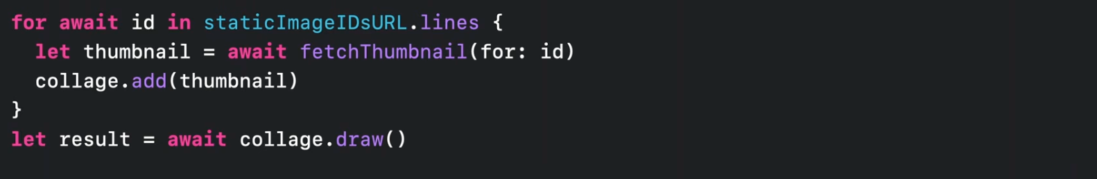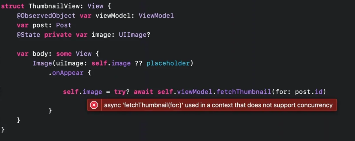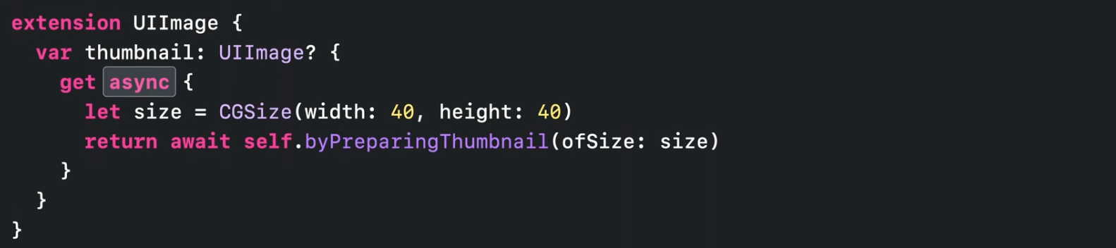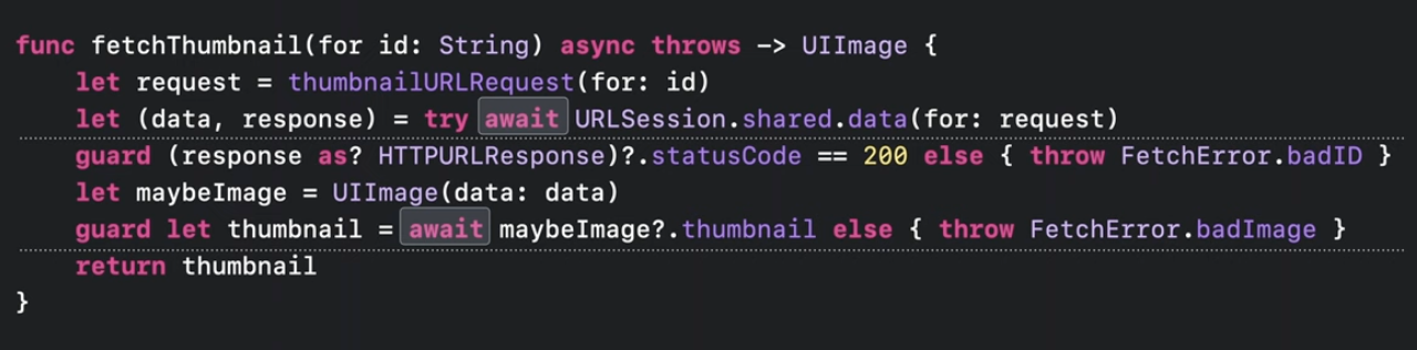 - ex) func fetchTumbnail(for id: String) async throws → UIImage